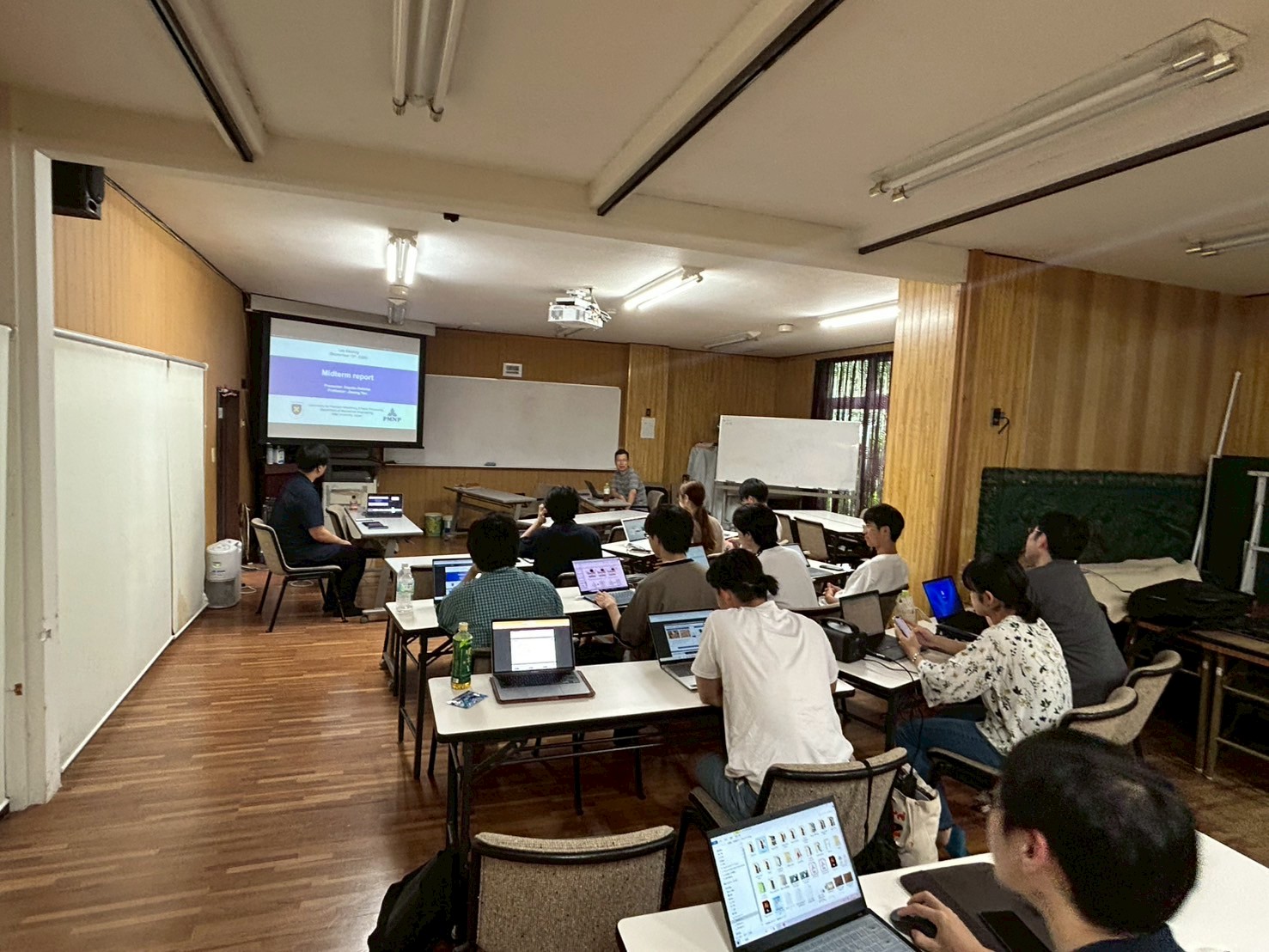 On the day 1, B4 students gave midterm presentations on their research in English at the hotel.